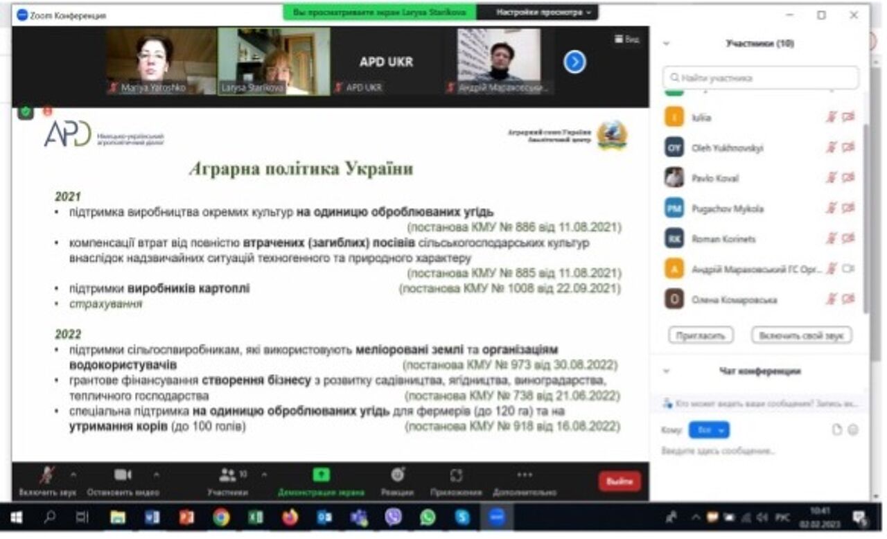 Am 16.03.2023 trafen sich Mariya Yaroshko, Projektleiterin des APD, und Frank Müller, Agrarattaché der Botschaft der Bundesrepublik Deutschland in der Ukraine, mit dem Vorsitzenden des Ausschusses für Agrar- und Bodenpolitik der Werchovna Rada der Ukraine, Oleksandr Hajdu.