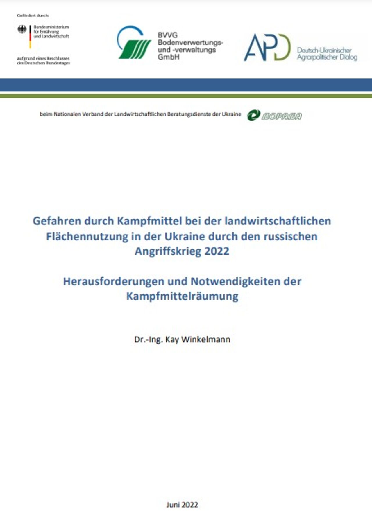 Broschüre "Gefahren durch Kampfmittel bei der landwirtschaftlichen Flächennutzung in der Ukraine durch den russischen Angriffskrieg 2022. Herausforderungen und Notwendigkeiten der Kampfmittelräumung"