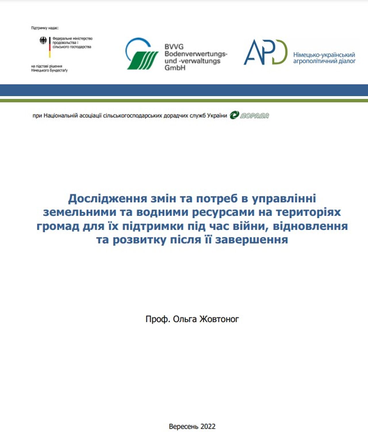 Broschüre "Analyse von kriegsbedingten Veränderungen in Bezug auf die Land- und Wasserressourcen in ausgewählten Territorialen Gemeinden der Ukraine. Erste Handlungsempfehlungen zu dem geplanten Wiederaufbau"